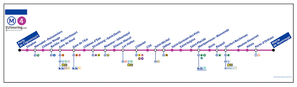 La Ligne 4 croise TOUTES (All Lines) les Lignes du Réseau parisien (Métro et RER) Elle est la référence du trafic du réseau Métro Urbain.